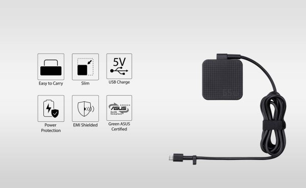 ASUS AC65-00 65W USB Type-C Adapter/Charger Connector, USB PD 3.0 Technology with 5V/3A, 9V/3A, 15V/3A and 20V/3.25A Output for Laptop, Black