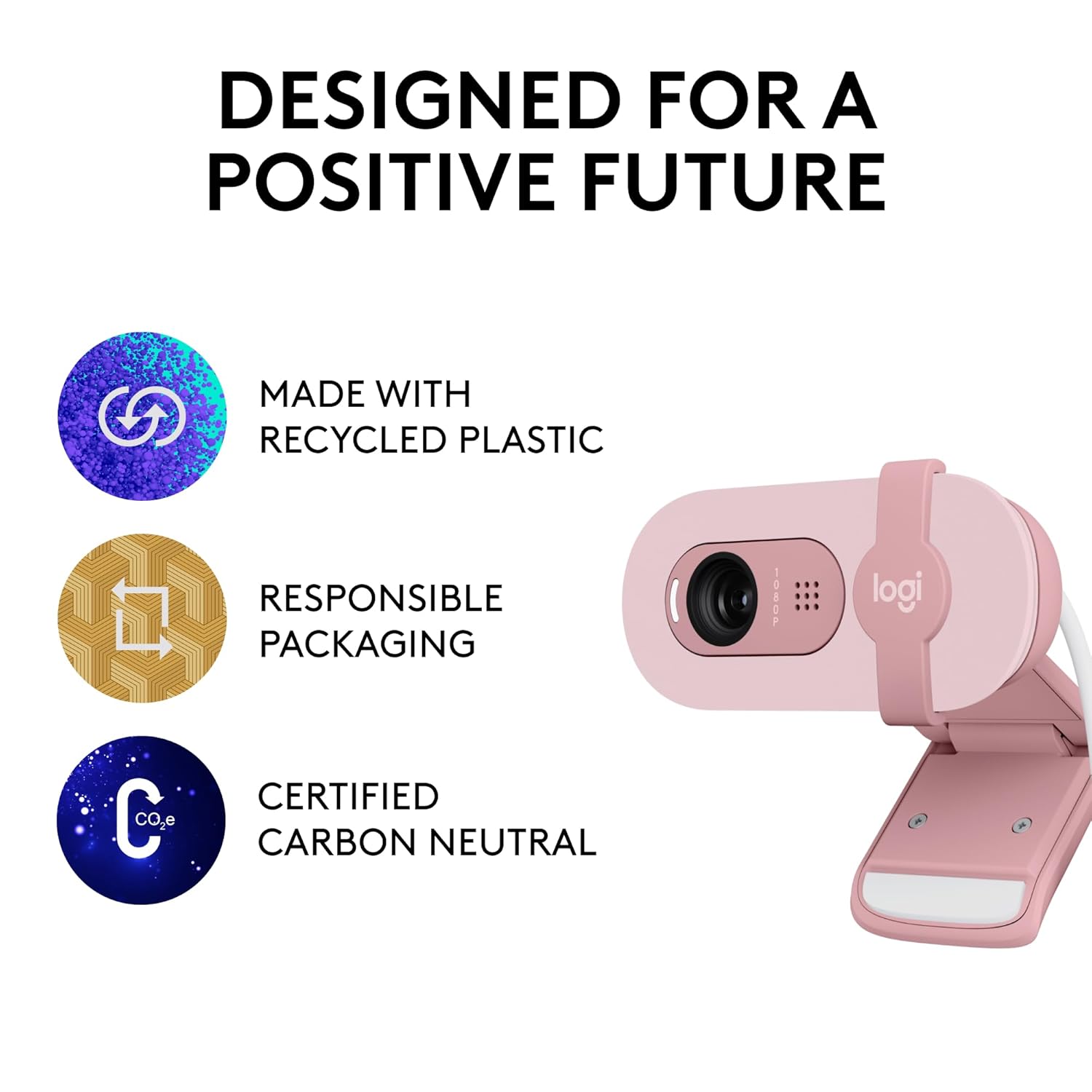 The Logitech Brio 100 Full HD 1080p Webcam provides clearer video quality, so you look better in video calls. RightLight boosts brightness by up to 50%, reducing shadows so you look your best—compared to previous-generation Logitech webcams (1). The integrated webcam privacy shutter lets you enjoy peace of mind with a simple slide when you’re not on a video call. Sound better with a built-in microphone. The Brio 100 Full HD Webcam is compatible with most video calling platforms, including Microsoft Teams, Google Meet and Zoom. Refined colors brighten up your personal workspace so you can express yourself. Made with a minimum 34% post-consumer recycled plastic for a better future (2).