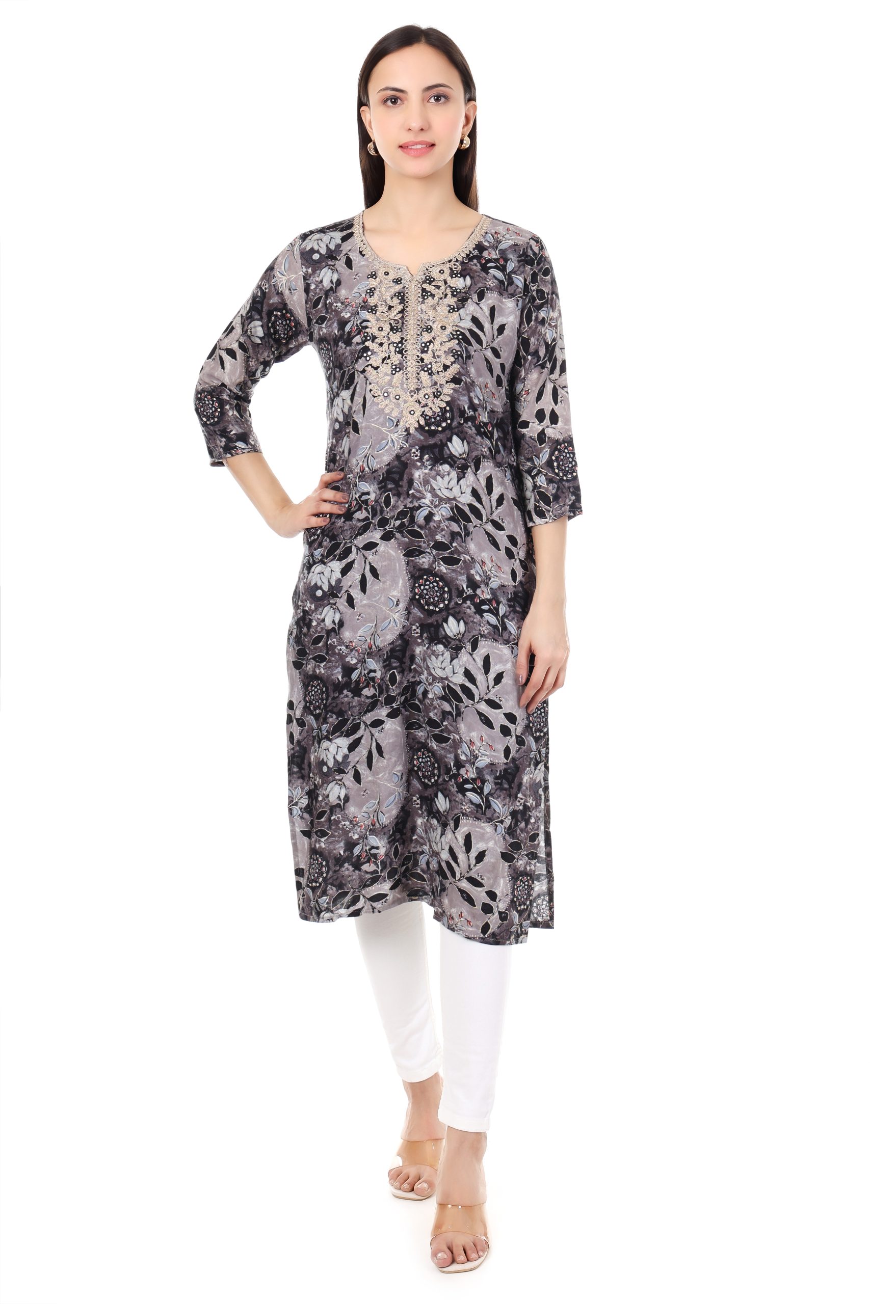 - DESIGN: Elegant straight-cut kurta featuring a sophisticated grey and black floral print pattern with intricate detail throughout